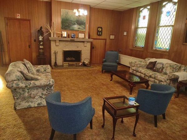 We meet in our fellowship hall's cozy/comfortable parlor.